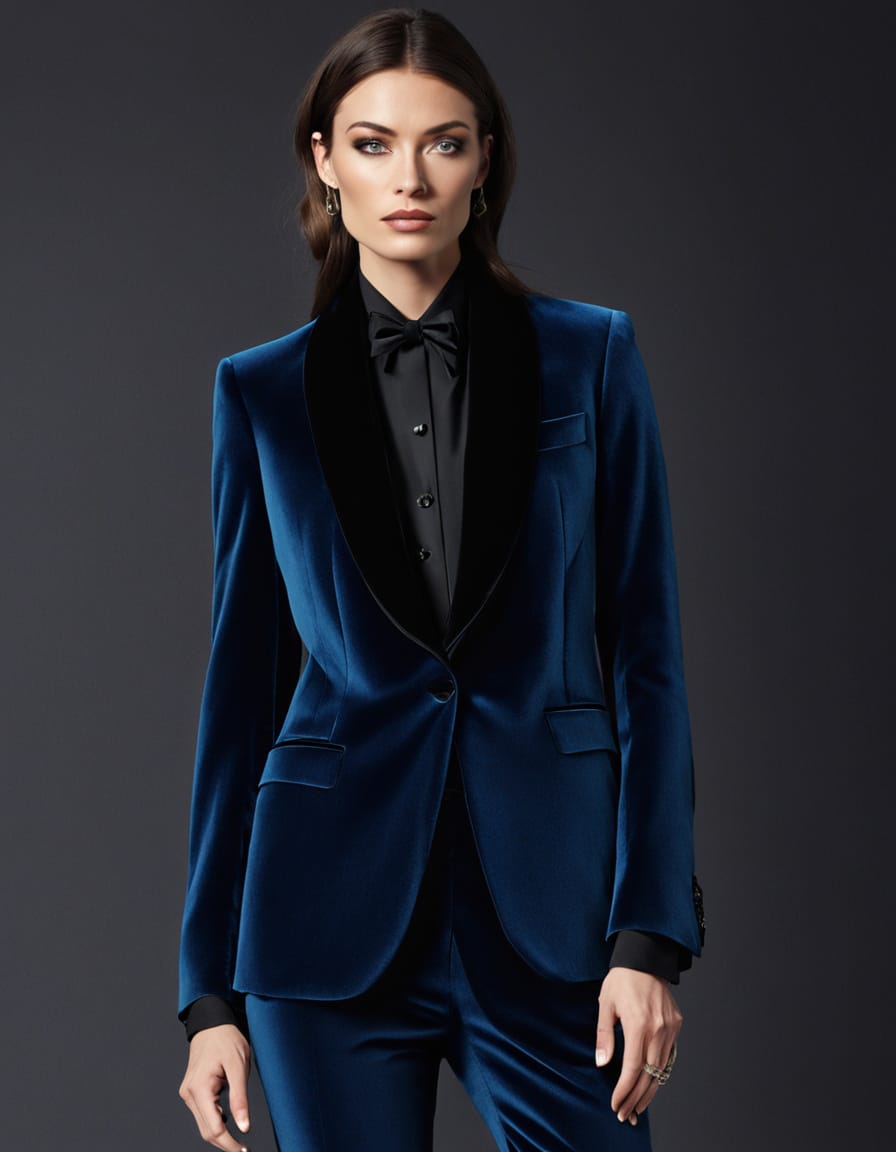 Women’s, Single-Breasted, Dark Navy Blue Velvet, Two-Piece Tuxedo. Available with either matching velvet or contrast black trousers.